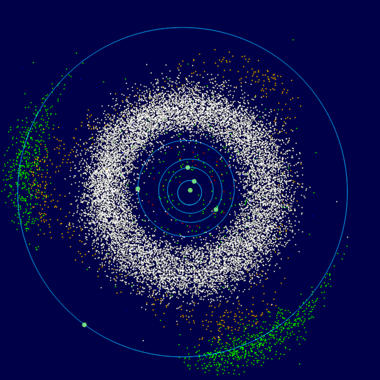 рис.3 Группы астероидов: белые — астероиды главного пояса; зелёные за внешней границей главного пояса — троянцы Юпитера; оранжевые — группа Хильды. Автор: Mdf. Источник: wikipediaБлиже всего к Солнцу находится гипотетический пояс Вулканоидов — малых планет, орбиты которых лежат полностью внутри орбиты Меркурия. Компьютерные расчёты показывают, что область, лежащая между Солнцем и Меркурием, гравитационно стабильна и, скорее всего, там существуют маленькие небесные тела. Практическое обнаружение их затруднено близостью к Солнцу, и до сих пор ни одного Вулканоида не обнаружено. Косвенно в пользу существования вулканоидов говорят кратеры на поверхности Меркурия.