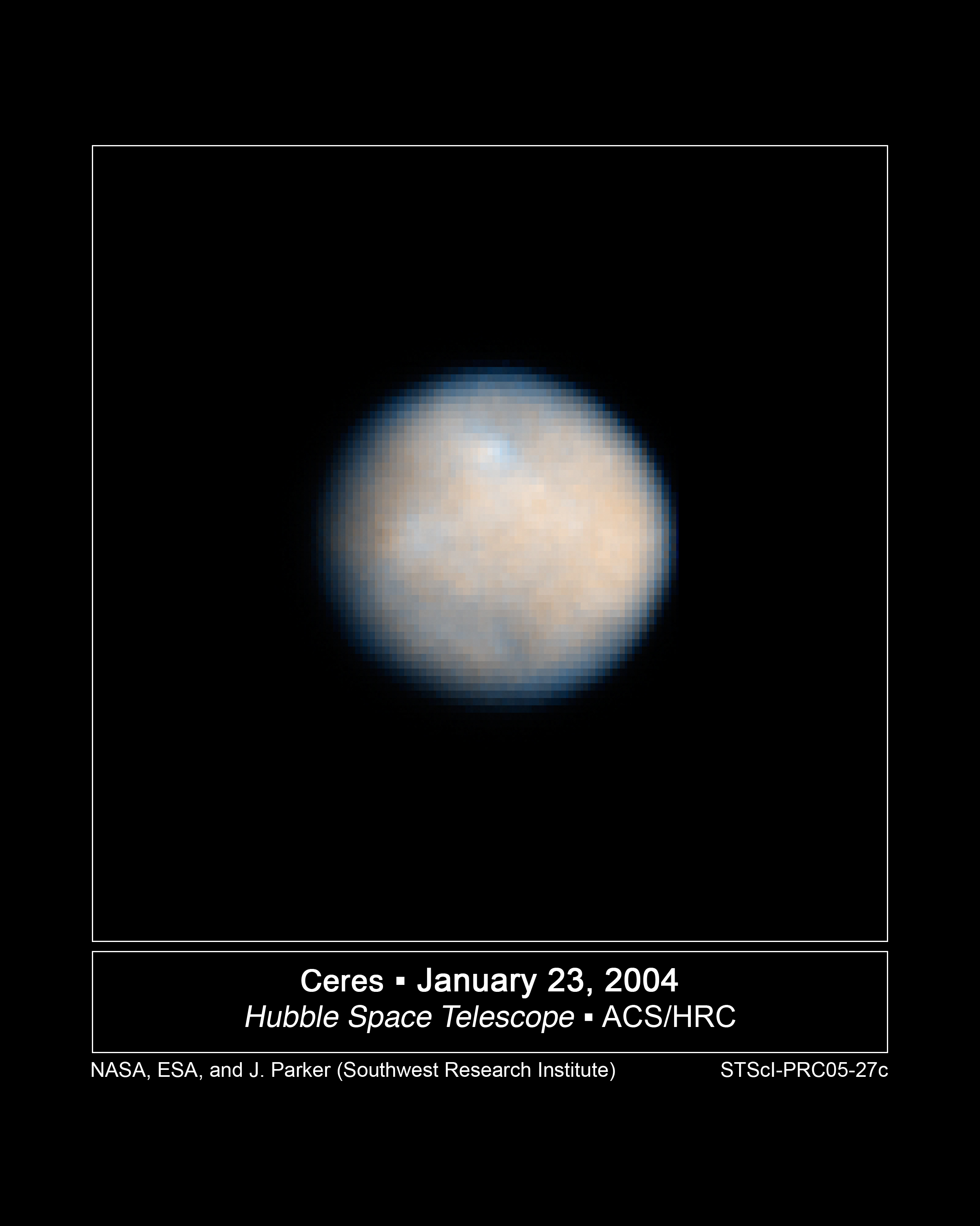 рис.2 Первый открытый астероид Церера, позднее отнесённая к малым планетам. Credit: NASA, ESA, J.Parker (Southwest Research Institute), P.Thomas (Cornell University), L.McFadden (University of Maryland, College Park), and M.Mutchler and Z.Levay (STScI)Первой обнаруженной малой планетой стала Церера, открытая итальянским астрономом Джузеппе Пиацци в сицилийском городе Палермо (1801 г.). Сначала Джузеппе подумал, что увиденный им объект является кометой, но после определения немецким математиком Карлом Фридрихом Гауссом параметров орбиты космического тела становится ясно, что оно скорее всего является планетой. Через год по эфемериде Гаусса Цереру находит немецкий астроном Г. Ольберс. Тело, названное Пиацци Церерой, в честь древнеримской богини плодородия, находилось на том расстоянии от Солнца, на котором согласно правилу Тициуса-Боде должна была располагаться большая планета солнечной системы, поисками которой занимались астрономы с конца XVIII века.