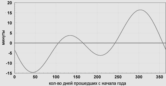 Ниже дан график отклонения истинного солнечного времени от среднего или равномерного.