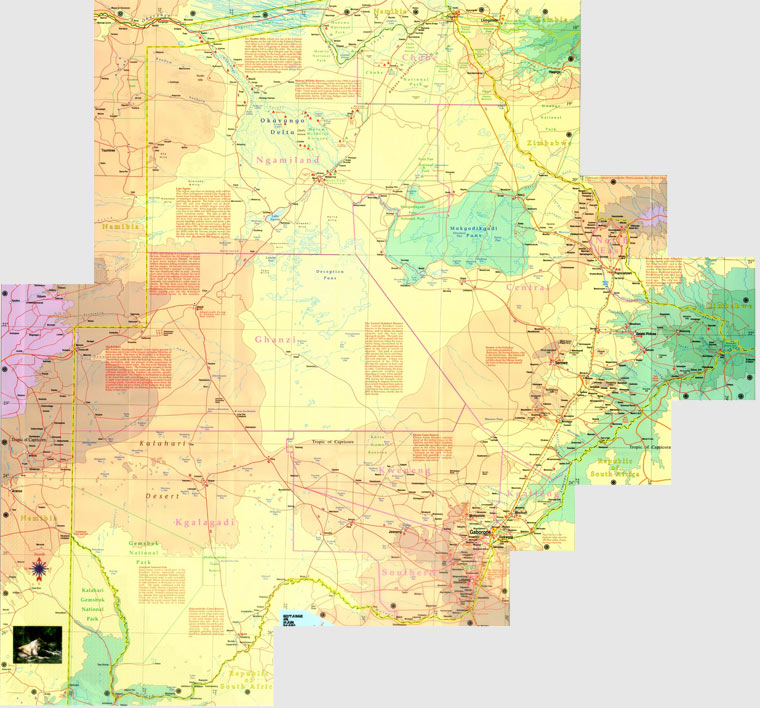 В связи с тем, что данная карта защищена авторскими правами на сайте Gect.ru дана ее уменьшенная копия низкого разрешения. Для скачивания карты в полном размере переходите на сайт первоисточник по ссылке карта Ботсваны. Размер карты 1,9 МБ