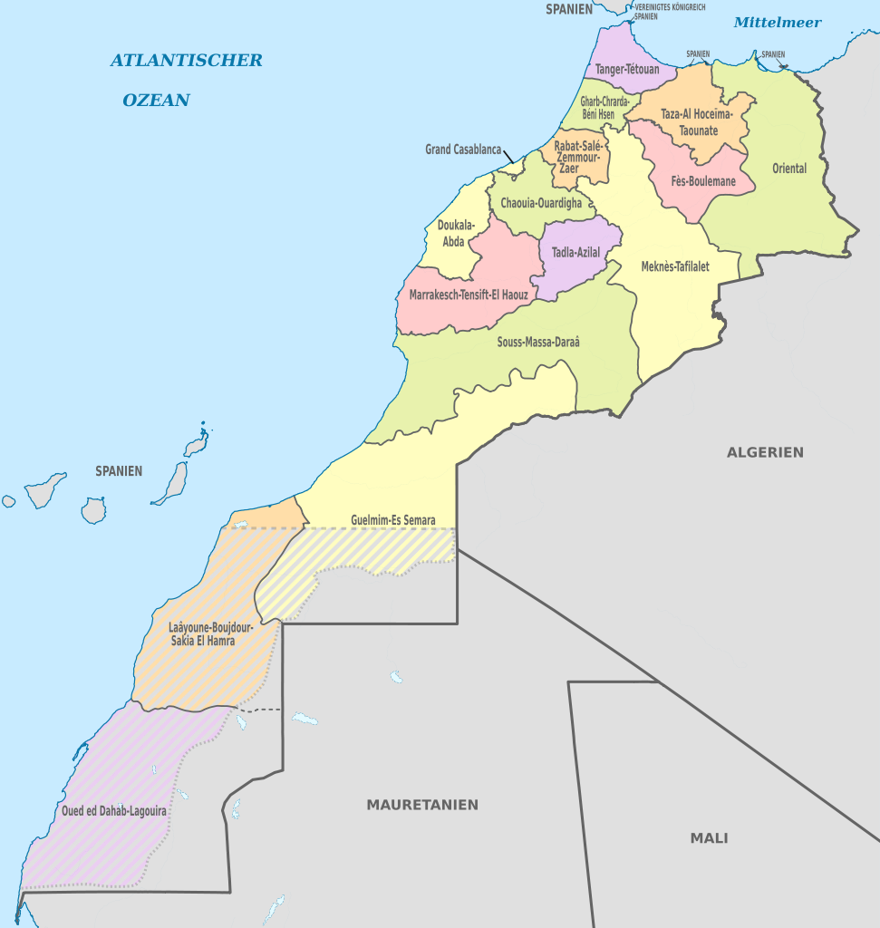 Первый высший уровень образуют 16 областей, 3 из которых находятся на территории частично признанного государства Западная Сахара.