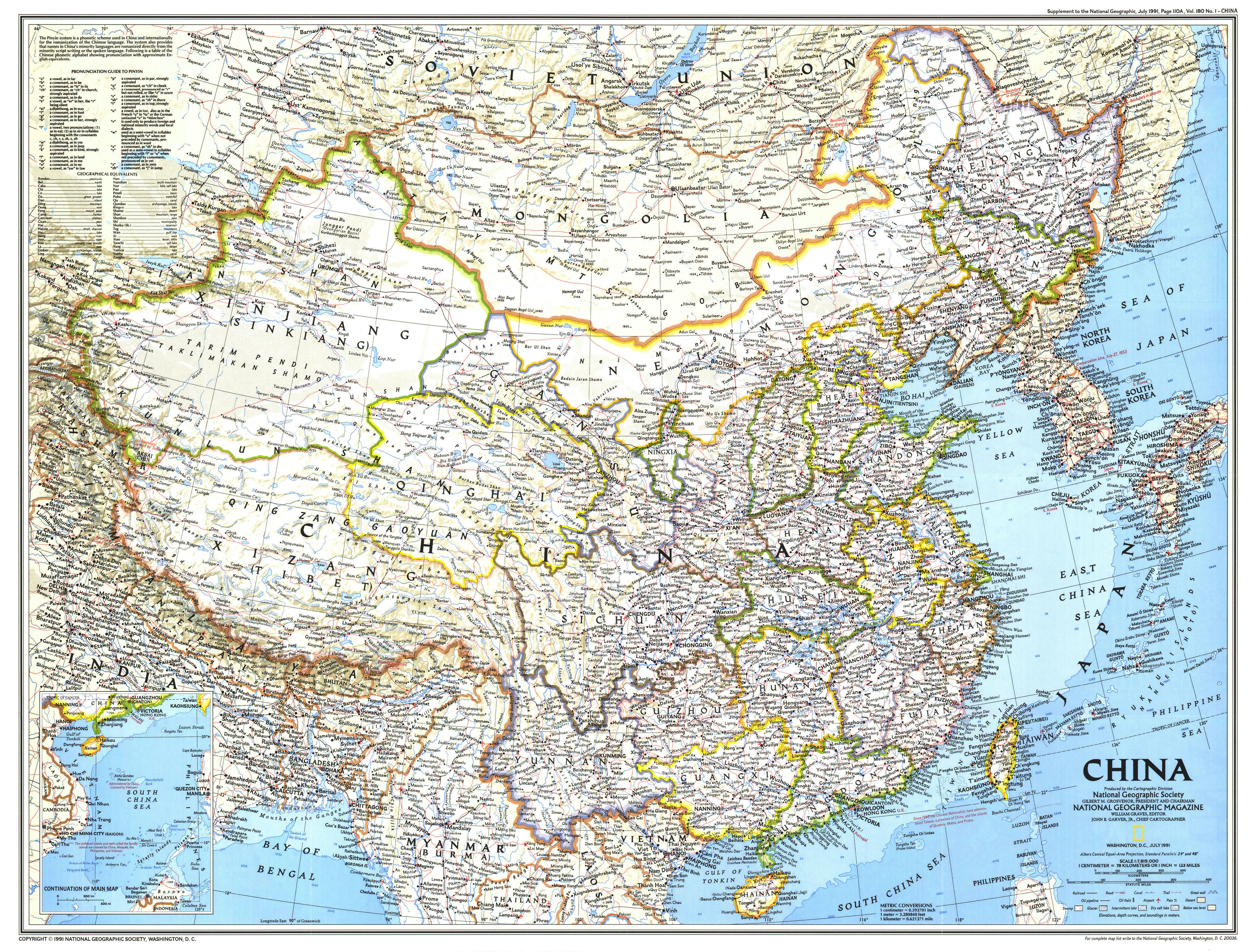 С отмеченными границами провинций, городами, реками, озерами, высотами над уровнем моря и подробной схемой железных и автомобильных дорог.