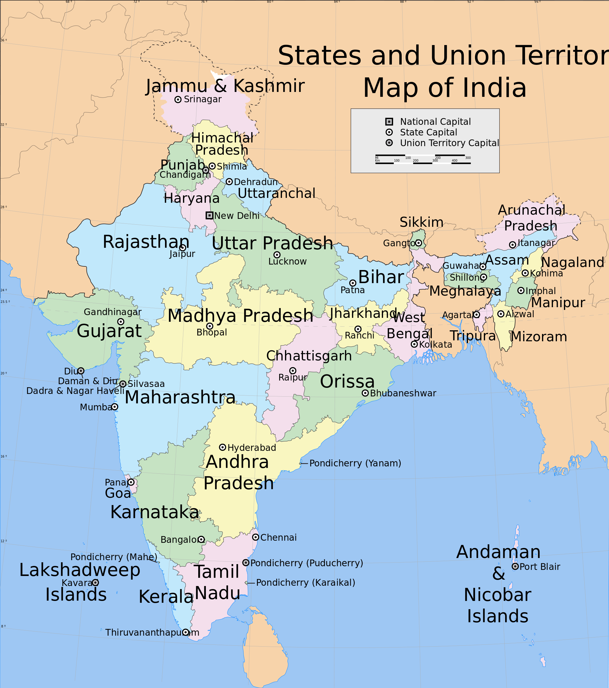 На первом уровне находятся 28 штатов и 7 союзных территорий, сильно различающиеся по площади, численности населения и правовому статусу.