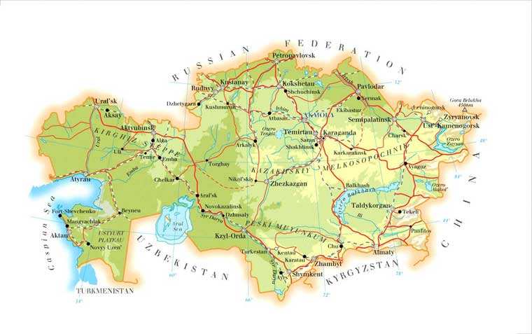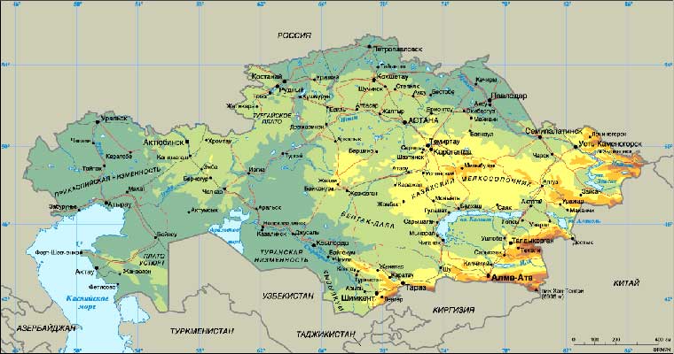 Скачать физическую карту Казахстана на русском языке. Размер карты 137 КБ Скачать карту