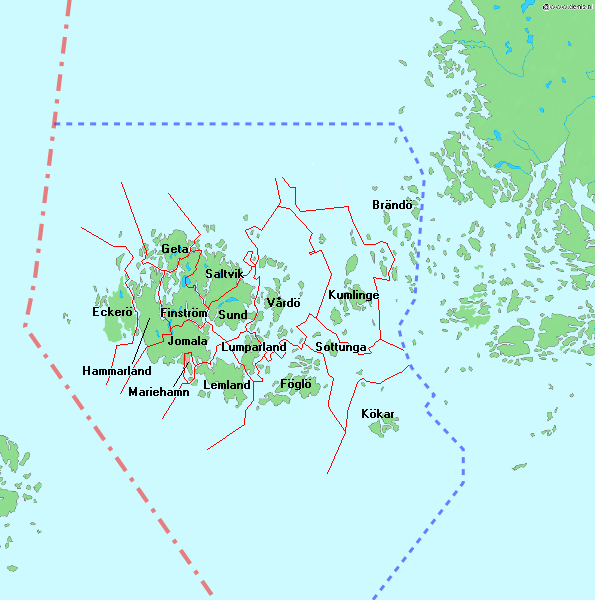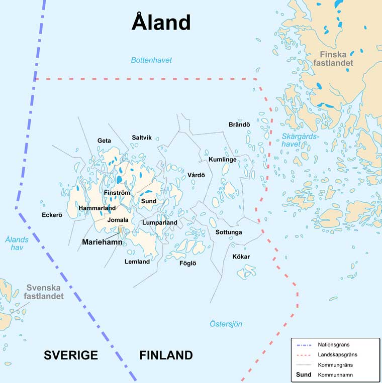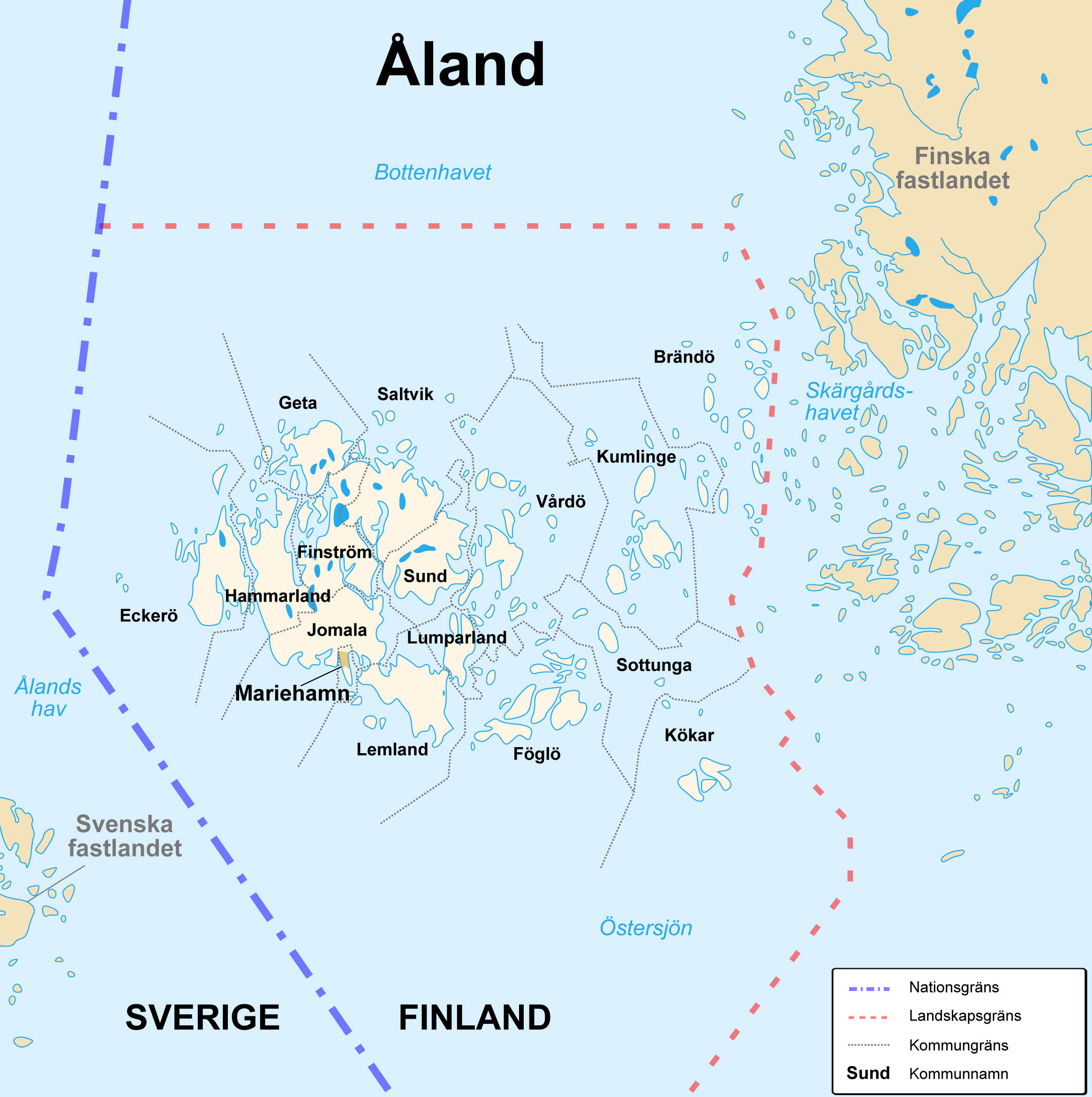 На данную карту нанесены государственная граница между Финляндией и Швецией, административная граница области Финляндии Аландские острова, подписаны названия коммун островов.
