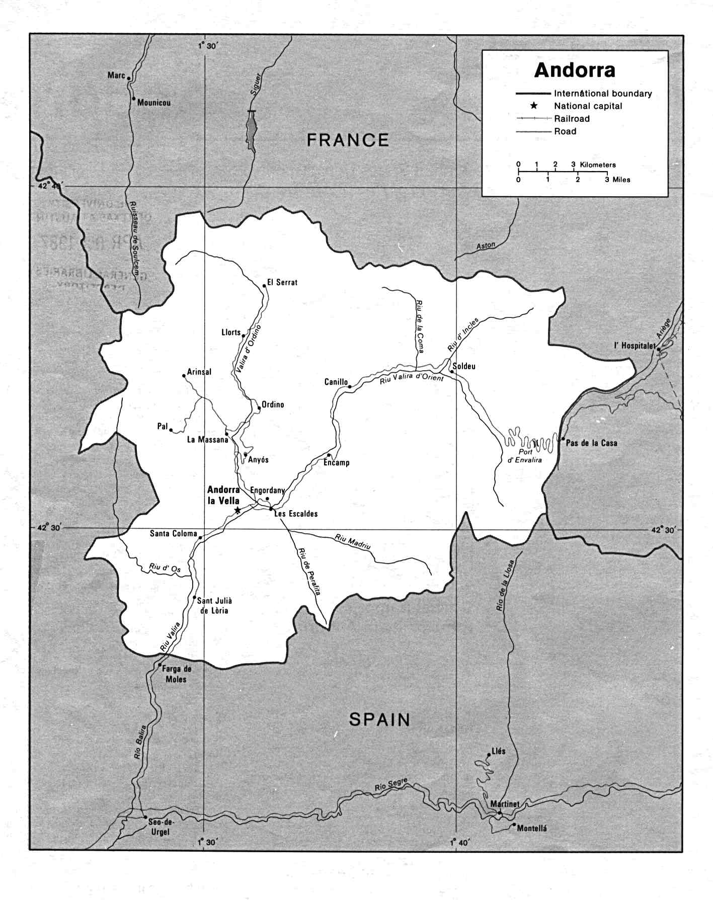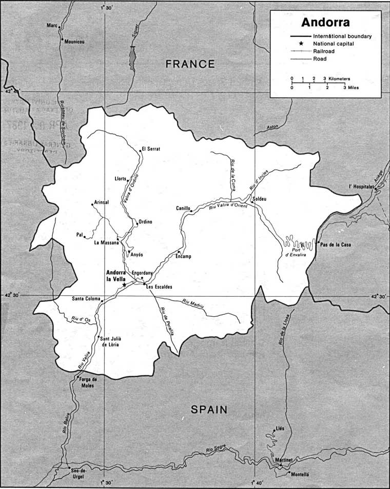 На карте отмечены основные автомобильные дороги Андорры и ряд населенных пунктов.