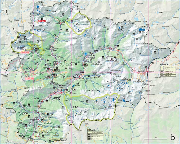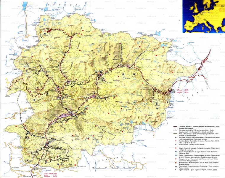На карте отмечены основные достопримечательности и важные объекты инфраструктуры Андорры.