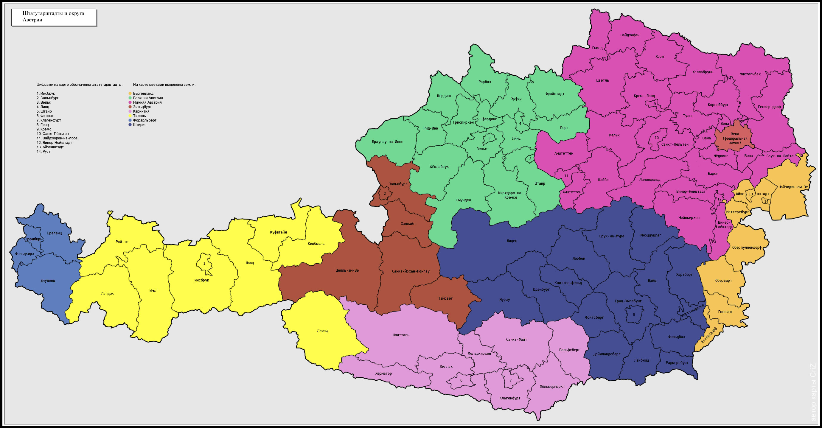 Скачать карту административного деления Австрии на земли, штатутарштадты (города, приравненных в административном отношении к округам) и округа. Размер карты 793 КБ Скачать карту