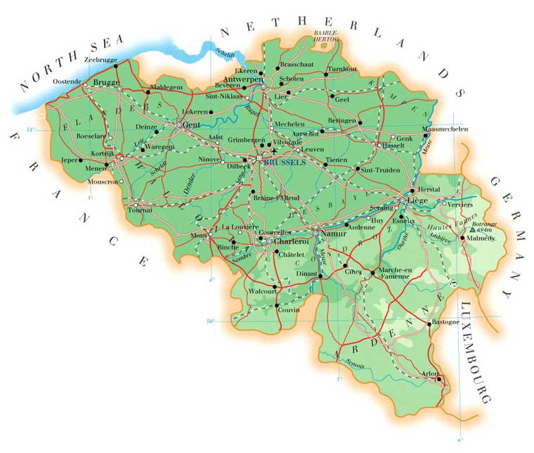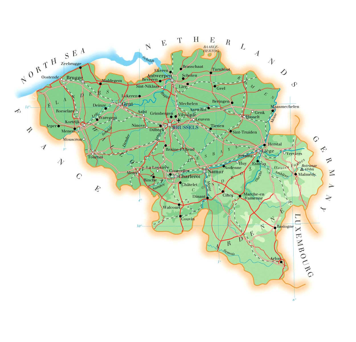 Скачать физическую карту Бельгии с отмеченными городами и дорожной сетью. Размер карты 124 КБ Скачать карту