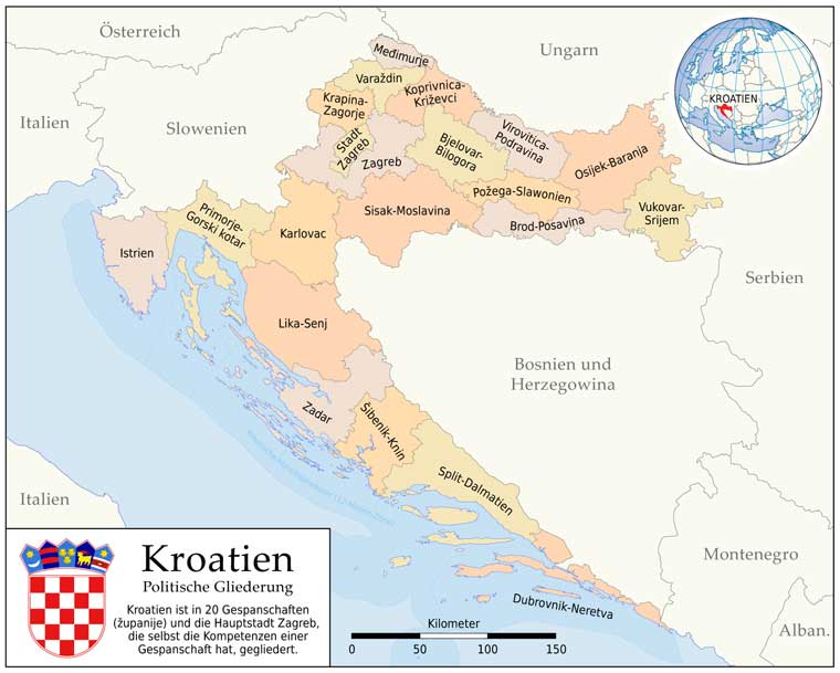 Административно Хорватия поделена на 20 жупаний: Беловарско-Билогорскую, Бродско-Посавскую, Вараждинскую, Вировитицко-Подравскую, Вуковарско-Сремскую, Дубровницко-Неретванскую, Загребскую, Задарскую, Истрийскую, Карловацкую, Копривницко-Крижевацкую, Крапинско-Загорскую, Лицко-Сеньскую, Меджимурскую, Осиецко-Бараньскую, Пожежско-Славонскую, Приморско-Горанскую, Сисацко-Мославинскую, Сплитско-Далматинскую, Шибенско-Книнскую и Город Загреб.