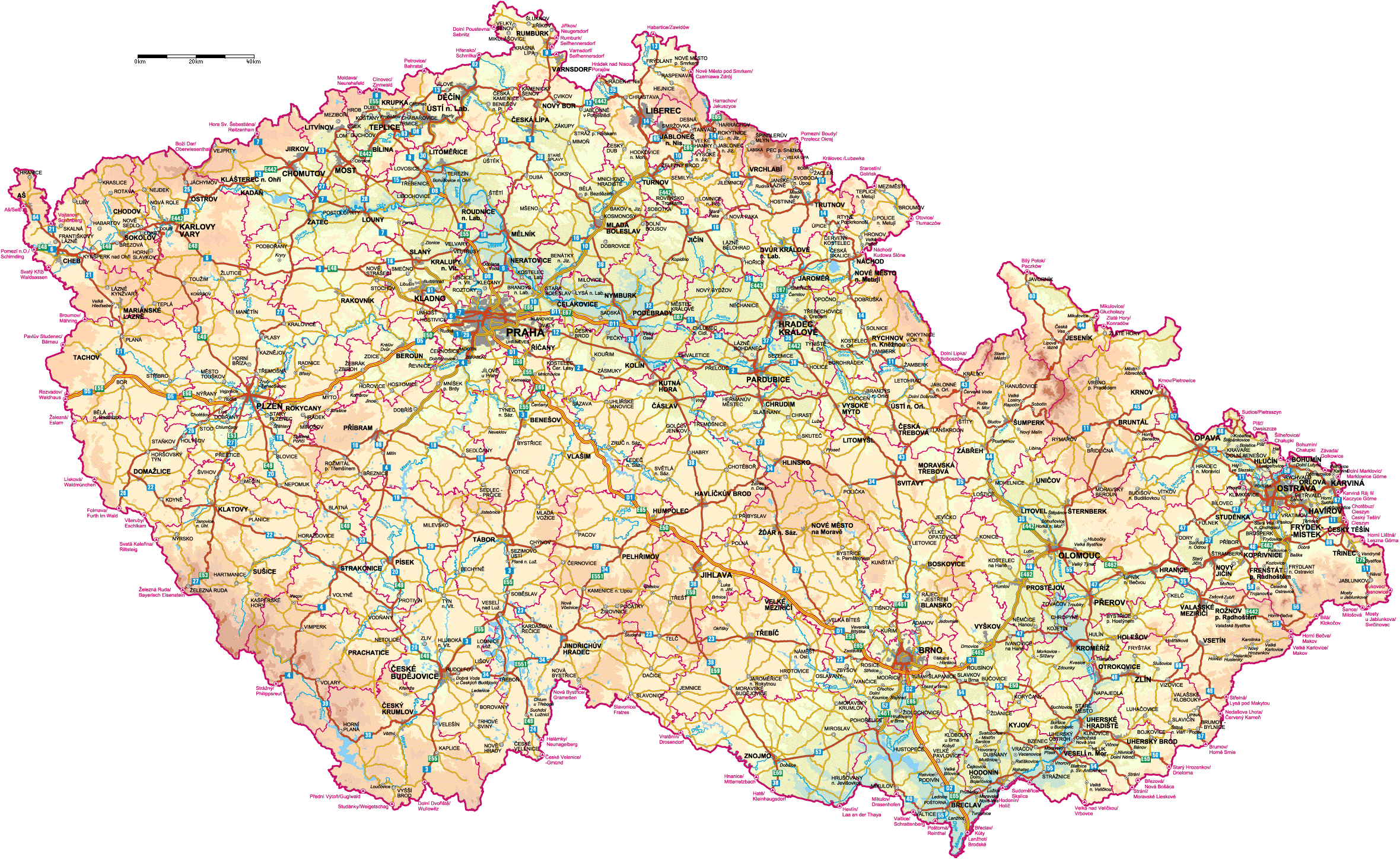 На данной физической карте Чехии также отмечены: населенные пункты страны, автомобильные дороги, границы между районами страны.