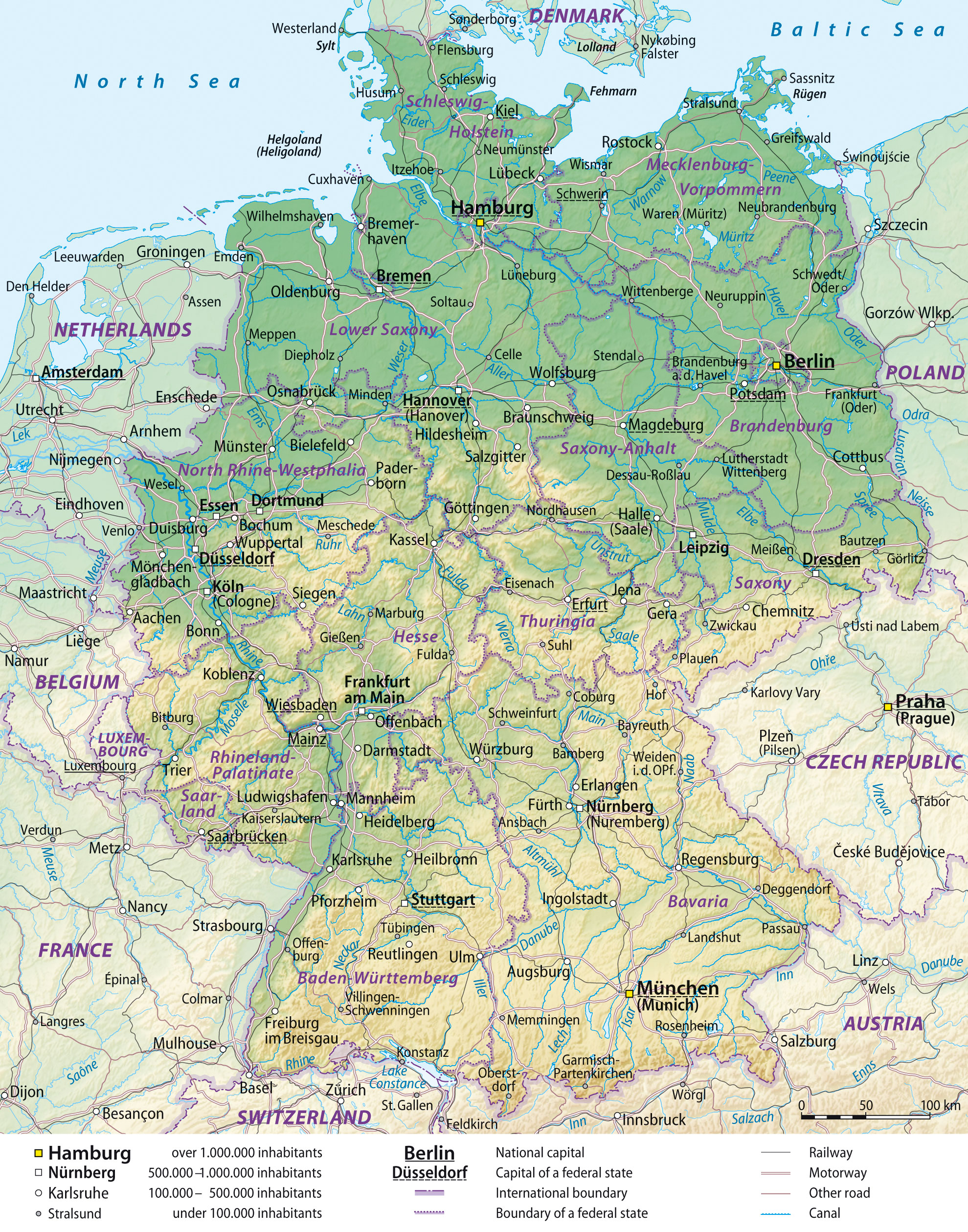 Скачать физическую карту Германии с границами земель, отмеченными городами, нанесенной дорожной и речной сетью. Размер карты 1,71 МБ Скачать карту