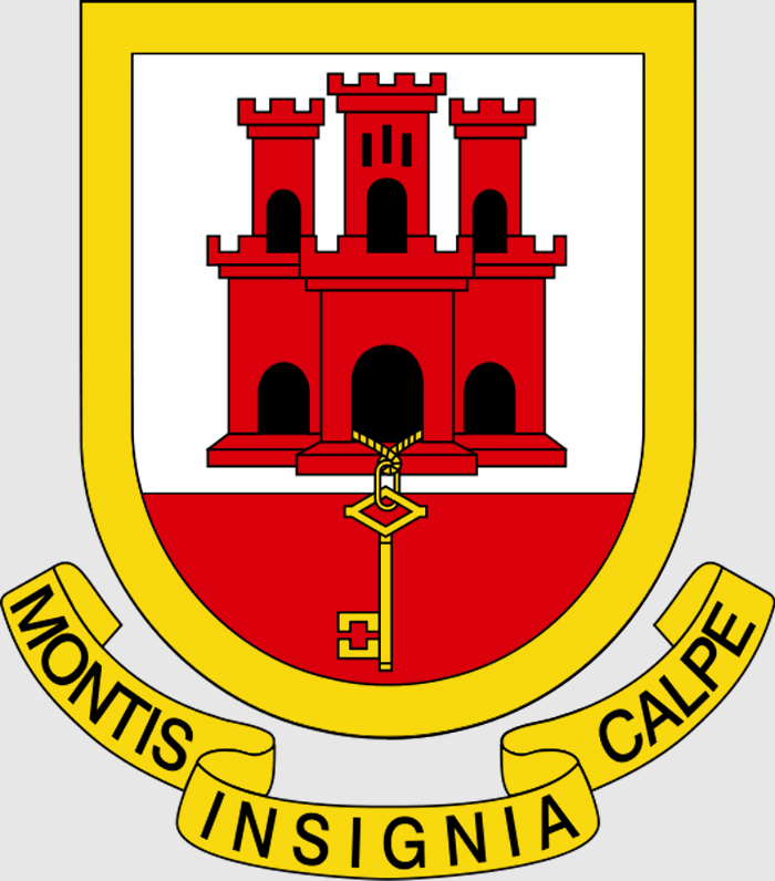Герб ГибралтараГерб Гибралтара представляет собой двуцветный щит с золотой обводкой, нижнюю треть которого занимает полоса красного цвета, а верхние две трети — белого. В центре белой полосы помещено изображение замка с тремя башнями. У каждой башни замка имеется окно и дверь. Из центральной двери главной (центральной) башни свисает золотого цвета цепь с золотым ключом. Под щитом расположена золотого цвета лента с латинским девизом «MONTIS INSIGNIA CALPE», что на русский можно перевести как «Эмблема горы (скалы) Калпа», т.е. скалы на которой стоит крепость Гибралтар. Данная надпись была добавлена в 1836 году в память о Великой осаде Гибралтара в 1779-83 гг.