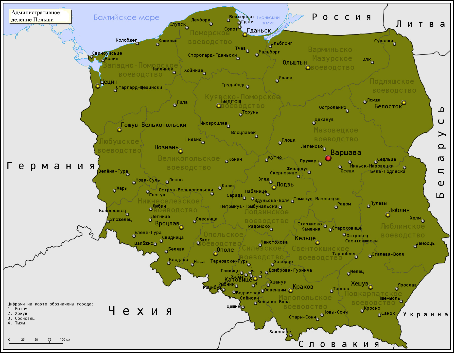 Скачать карту польских воеводств. Размер карты 1,5 МБ Скачать карту