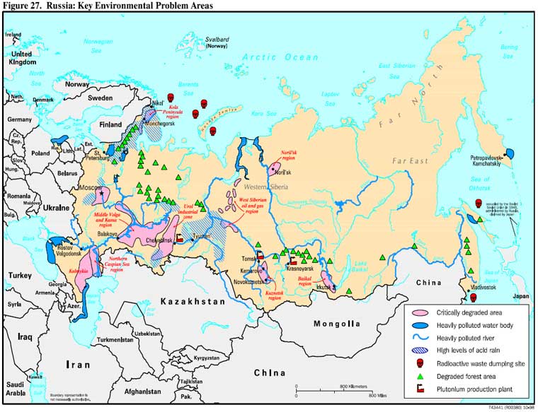 Показывает области с высокой степенью деградации почвенного покрова, загрязнением радиоактивными изотопами, обозлесением и прочими экологическими проблемами.