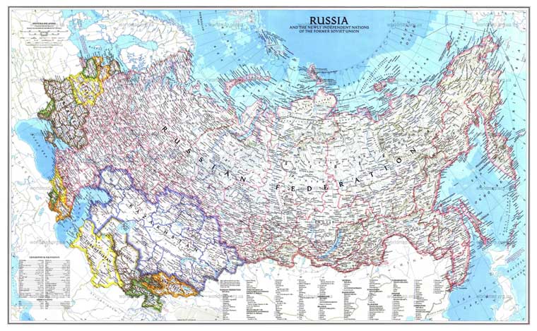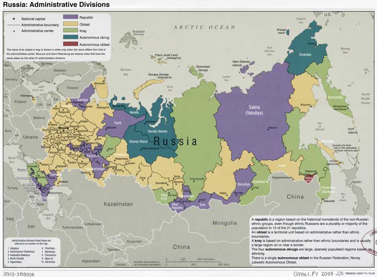 На 83 субъекта Российской Федерации, число которых постоянно уменьшается за счет присоединения слабозаселенных либо экономически слаборазвитых регионов к соседним регионам с более благоприятной экономической ситуацией. Из 83 субъектов 1 автономная область, 2 города федерального значения, 4 автономных округа, 9 краёв, 21 республика и 46 областей.