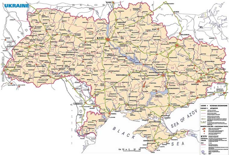 Скачать дорожную карту Украины с указанием расстояний между городами и отмеченными городами. Размер карты 353 КБ Скачать карту