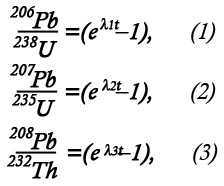 Pb, U и Th обозначают содержание в минералах изотопов свинца, урана и тория; l1, l2 и l3 — константы распада изотопов 238U, 235U, 232Th.