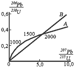 Однако чаще различные уравнения дают разные значения возраста одного и того же минерала. В этом случае для установления истины прибегают к построению диаграммы в координатах 206Pb/238U: 207Pb/235U (см. ниже). На неё наносят кривую OA (конкордия), вычисленную теоретически для разных возрастов, и прямую OB (изохрона), на которую ложатся результаты измерений для нескольких исследованных одновозрастных минералов. Истинным возрастом считается значение на пересечении кривой OA с прямой OB.